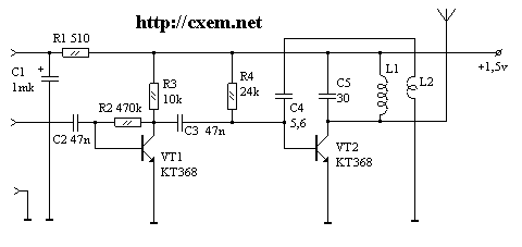 В отличии от многих других, в этом РМ уход частоты, даже при касании рукой, минимальный за счет оригинального включения обратной связи. При питании 1,5 В дальность передатчика составляет 150 метров, при этом уход частоты в диапазоне температур -20...+30 грд.С составляет 500 кГц. Генератор ВЧ выполнен на транзисторе VT2. Высокая стабильность обеспечена благодаря введению положительной обратной связи (последовательная цепочка L2C4). Катушка L1 содержит 6 витков провода ПЭЛ-0,53, намотанных на каркасе диаметром 3,5 мм; L2-3 витка провода ПЭЛ-0,25 поверх катушки L1.