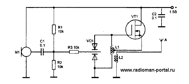 В генератор входят элементы VT1, VD1, LI, L2,С2, R3, а также соединительные и общий провода. Модулирующий сигнал с выхода микрофона Ml через конденсатор С1 и делитель напряжения Rl, R2, R3 поступает на варикапную матрицу VD1 типа КВС111А, изменение емкости которой приводит к частотной модуляции задающего генератора. Делитель напряжения на резисторах Rl и R2 служит для установки рабочей точки варикапа VD1. Катушка LI - бескаркасная, она состоит из 7 витков провода ПЭВ 0,44 с отводом от 3 витка, считая от заземленного вывода. Внутренний диаметр катушки LI - 4 мм. Катушка L2 содержит 1 виток того же провода, что и катушка L1. Ее нужно разместить соосно катушке L1 и по возможности ближе к ее заземленному выводу. В качестве антенны используется отрезок монтажного провода длиной 0,8 м, который для компактности может быть скручен в спираль. Настройка передатчика сводится к установке частоты 88-108 МГц путем изменения индуктивности L1. Частоту настройки контролируют по промышленному приемнику. Транзистор генератора должен иметь ток не менее 1-1,5 мА (при замкнутой накоротко катушке L1). В заключение хотелось бы отметить, что при увеличении напряжения источника питания до 4,5 В выходная мощность высокочастотного генератора возрастет до 10 мВт. При этом для сохранения девиации частоты рекомендуется подобрать сопротивление резистора R3.