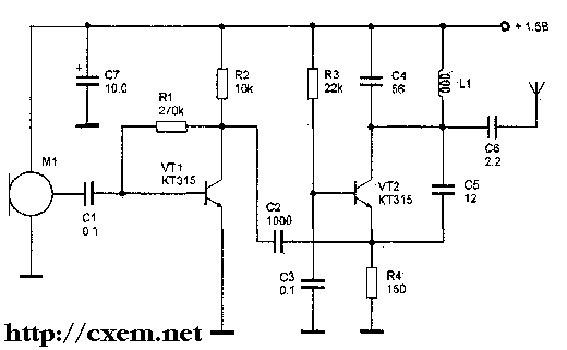 Этот радиомикрофон работает в диапазоне 100-108 МГц с частотной модуляцией. Дальность приема сигнала состав-ляет около 50 м. Питание устройства осуществляется от источника питания от 1,5 до 9 В. Принципиальная схема представлена на рис. 1. Передатчик состоит из однокаскадного усилителя звуковой частоты и однокаскадного генератора высокой частоты. Задающий генератор собран по распространенной схеме. Частота несущей определяется эле-ментами С4, LI, C5 и межэлектродными емкостями транзистора VT2. Модулирующий усилитель выполнен на транзисторе VT1 типа КТ315. Усиленный сигнал через конденсатор С2 поступает на эмиттер тран-зистора VT2 типа КТ315. Модулирующее напряжение вызывает изме-нение емкости перехода база-эмиттер транзистора VT2 и, тем самым, осуществляет час-тотную модуляцию задающего генератора. Сигнал с генератора через конденсатор С6 поступает в антенну, в качестве ко-торой используется отрезок провода длиной 10-40 см. Катушка L1 бескаркасная, намотана на оправке диаметром 3 мм и содержит 4 витка провода ПЭВ 0,6 мм, шаг намотки 2 мм.