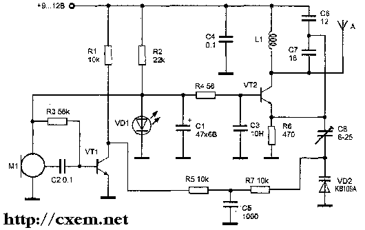 Модулирующий усилитель выполнен на транзисторе VT1 типа КТ315. Напряжение звуковой частоты на его вход поступает с электретного микрофона с усилителем. Ml типа МКЭ-3 и ему подобным. Усиленное напряжение звуковой частоты с коллектора транзистора VT1 поступает на варикап VD2 типа КВ109А через фильтр нижних частот на резистор R5 и конденсатор С5, и резистор R7. Варикап VD1 включен последова-тельно с подстроечным конденса-тором С8 в эмиттерную цепь транзис-тора VT2. Частота колебаний задающего генератора, выполненного на транзи-сторе VT2 типа КТ315 (КТ3102, КТ368), определяется элемента-ми контура L1, С6, С7 и емкостью С8 и VD1.