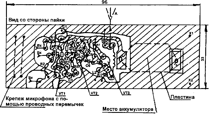 Катушка L1 содержит 1 виток провода ПЭЛ 0,3 мм; L4 - 4 витка ПЭЛ 0,3 мм. Катушка L2 - бескаркасная, намотана виток к витку на оправке 6 мм и содержит 22 витка провода ПЭЛ 0,6 мм. L3 намотана внавал на резисторе 100...200 кОм и содержит 60 витков провода ПЭЛ 0,11 мм. Аккумулятор расположен непосредственно на плате и закреплен латунной пластиной, которая выгнута по форме аккумулятора. Она вставлена в отверстия платы и пропаяна снизу. В точки Х1 и Х2 вставлены куски провода и пропаяны для получения минусового контакта аккумулятора. При наладке нужно сдвигом или растяжкой витков катушки L4, а при необходимости, и подбором конденсатора С5 добиться попадания несущей в нужный диапазон (30, 66, 108 МГц). Резистором R5 устанавливается необходимый уровень девиации частоты. После того как произведена настройка на требуемый участок диапазона, конденсаторами С7 и С8 добиваются максимума мощности сигнала. Для фиксации и жесткости катушки L4, ее вместе с VT2 желательно пропитать парафином.