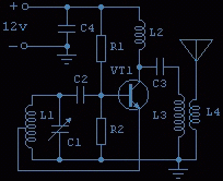 Катушки: L1 - 4 витка ПЭВ-1.0 на оправке 12мм, отвод от середины. L2 - дроссель 20 мкГн, я ставил от китайского приемника. L3 - 8 витков ПЭВ-1.0 на оправке 8мм, у меня она была намотана на оболочке кабеля РК-75. L4 - 6 витков того же провода и на той же оправке, расположена между 2-х половин L3. Хочу заметить, что никакие батарейки тут не катят, т.к. ток потредления около 0.5 А, поэтому нужен хороший блок питания. Транзистор должен стоять на хорошем радиаторе, иначе он может просто сгореть. Антенной служит штырь длиной 1м. У меня все работало сразу, понадобилось только поймать волну :) P.S. Когда я делал про-версию этого передатчика для вещания в пределах дачного массива (простого глушения оказалось мало ;) возникла проблема с устранением фона сети (а у нас там даже лампочки мигают из-за сварки). она была решена аналогично ПИЛОТовскому фильтру: параллельно сети до понижаеющего транса ставится 2 последовательно соединенных кондера 1мкф*400в, их средняя точка идет на массу устройства. ну и ессно все остальные меры и фильтрующий кандер в БП на 10 000мкф ))) После такой доработки ОЧЕНЬ слабый фон был слышен только при отключенном модуляторе, среди музыки его не разберешь...