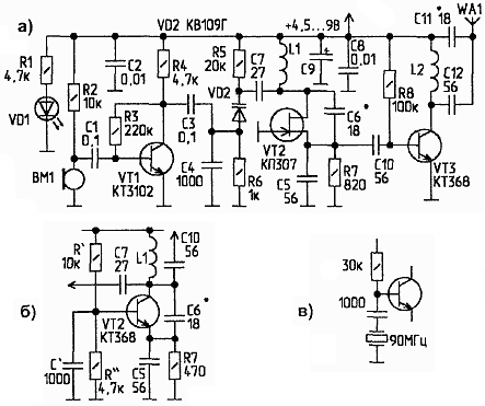 Среди начинающих радиолюбителей очень популярны миниатюрные микромощные радиопередатчики (в простонародье - "жучки"). Ведь если начинающий "паяльщик" услышал свой голос из радиоприемника в соседней комнате, то это значит, что он стал настоящим радиолюбителем. Схема моего "жучка" приведена на рис.1а. Печатная плата для него разработана по размерам спичечного коробка, так что с корпусом проблем нет.