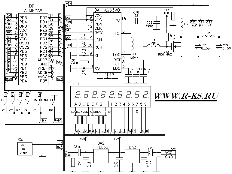 Малогабаритный стереофонический передатчик для высококачественной передачи звука в FM-диапазоне. Высокое качество передачи обеспечивается полностью цифровым алгоритмом обработки всех аналоговых сигналов. Все настройки передатчика - установка частоты излучения, выходной мощности, переключение режима МОНО/СТЕРЕО производится при помощи кнопок. Текущие значения параметров отображаются на семисегментном индикаторе. Для существенного увеличения дальности передачи можно использовать внешнюю антенну. Основные технические характеристики: