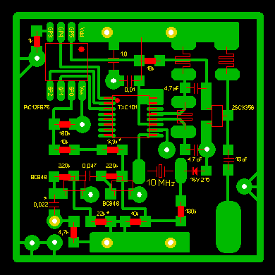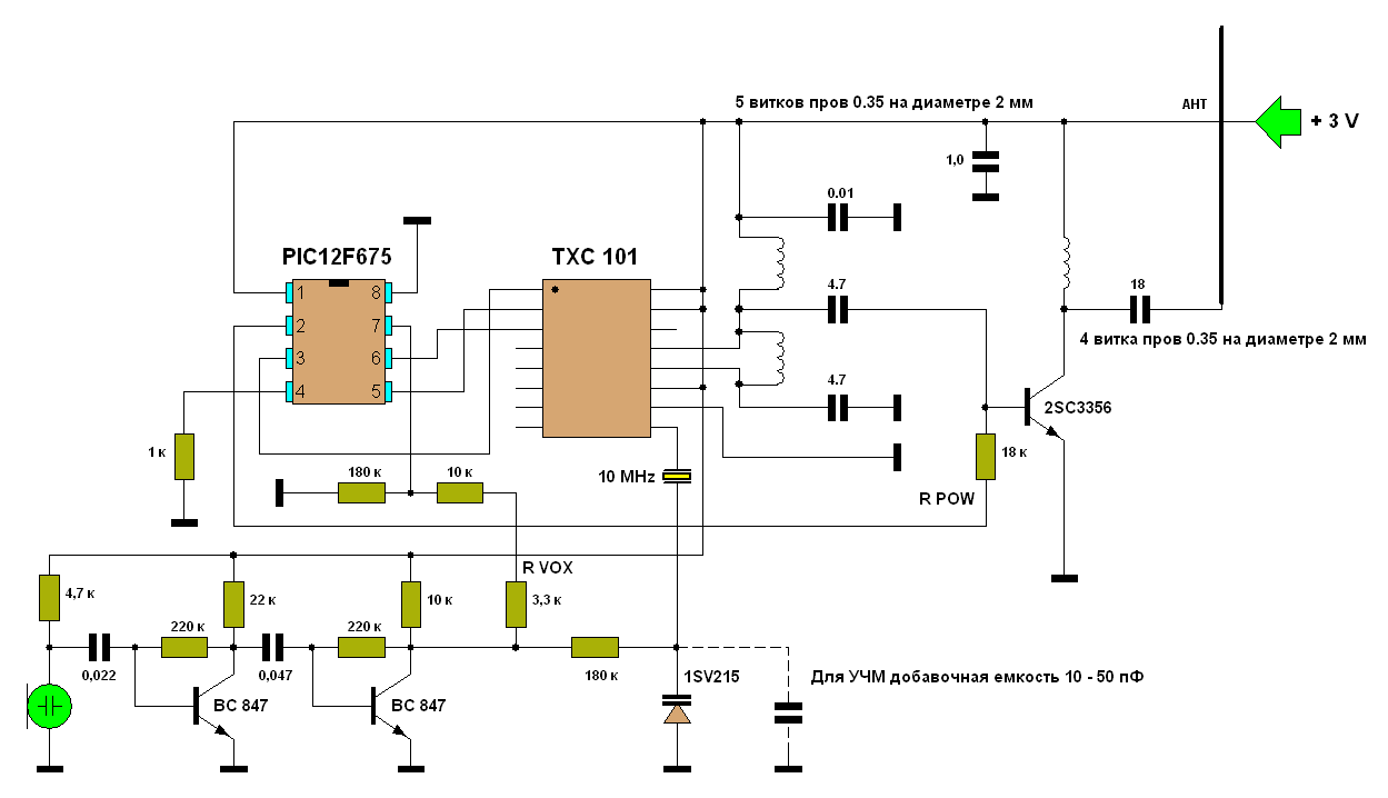 Устройством управляет микроконтроллер PIC12F675 . Он загружает данные в передатчик , управляет усилителем мощности и « следит » за уровнем НЧ сигнала с микрофонного усилителя.
