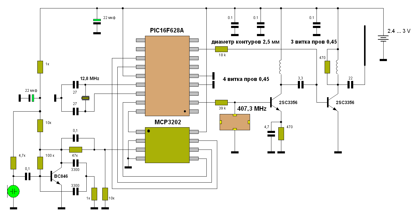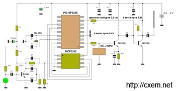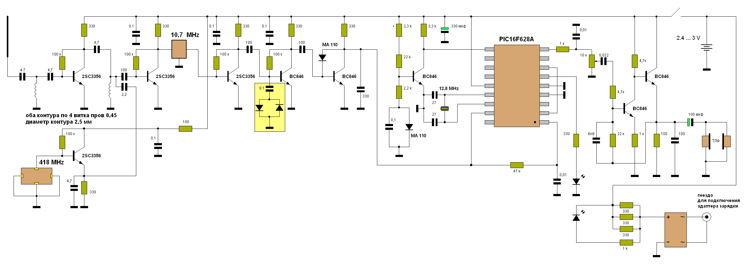 Опорные кварцы ПРМ и ПРД могут быть в пределах 10 — 16 МГц . Единственное условие , чтобы они были одинаковой частоты. При кварце 10 МГц частота дискретизации 10 Кгц . Она пропорционально растет с ростом частоты опорного генератора контроллера .Было принято решение остановиться на частоте 12,8 МГц , по причине доступности резонаторов при весьма хорошем качестве звука . Видимо кварцы возможно применить и на более высокие частоты , однако выше 16 МГц эксперименты не проводились . Устройство в целом в настройке не нуждается. Единственно , что придется подбирать — резистор датчика напряжения АКБ приемника . Следует позаботиться о том , чтобы светодиод «заморгал» ( сигнал , что батарея разряжена ) от напряжения 2,2 вольта ( резистор 3,3 к в базовой цепи ВС 846, обозначенный звездочкой на схеме ). Чувствительность приемника можно несколько повысить , заменив транзистор ВС846 ( 2й каскад УПЧ ) на более высокочастотный ( 2SC3356 ) .Однако при питании приемника более 3 вольт такой УПЧ может самовозбудиться! На близких расстояниях ( 0,5 — 1 м ) от передатчика приемник может « замолкать»или «фонить ». Это эффект «перегрузки» УПЧ сильным сигналом . Для устранения этого эффекта следует дополнить схему встречно параллельными диодами Шоттки ( на схеме обозначено желтым фоном ). Марка диодов HSM88AS. Код на корпусе С1 ( распространен в радиотелефонах СЕНАО 258 ). Скачать печатки в формате LAY и фото устройств. За прошитыми контроллерами обращаться к автору! Автор: Сергей (blaze),