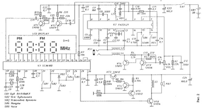 ![]() Главный тракт приема собран на микросхеме IC1 SC1088 (аналог TDA7088), выполненной в шестнадцативыводном миниатюрном корпусе для поверхностного монтажа. Усилитель звуковой частоты собран на микросхеме IC2 TDA2822 по мостовой схеме. На корпусе приемника расположены две кнопки настройки, светодиод индикатора включения питания, малогабаритная динамическая головка, регулятор громкости, совмещенный с выключением питания и разъем для наушников. При прослушивании программ на встроенную динамическую головку ВА1 в качестве антенны применяется отрезок провода со специальным штекером, включенный в разъем для наушников ХС1. Сигнал, принятый антенной, поступает на входной широкополосной контур L1, С1 ...СЗ и далее на вход УРЧ - вывод 11 микросхемы IC1. Усиленный сигнал радиочастоты и сигнал гетеродина, контуром которого является L2, С13, VD1, подключенные к выводу 5, поступают на смеситель внутри микросхемы. Сигнал ПЧ 70 кГц выделяется полосовым фильтром, пассивными элементами коррекции которого являются конденсаторы С11, С12, и поступает на вход усилителя-ограничителя - вывод 9. Конденсаторы С4, С6 являются элементами коррекции усилителя-ограничителя, с вы- хода которого сигнал поступает на ЧМ-демодулятор. Демодулированный сигнал, пройдя через фильтр НЧ-коррек-ции, внешним элементом которого является конденсатор С14, поступает на схему блокировки звука при настройке, режимом работы которой можно управлять изменением емкости конденсатора С8. В состав микросхемы входит триггер автоматической настройки на станцию. При нажатии на кнопку SB2 RESET на выводе 16 устанавливается напряжение питания, которое начинает плавно уменьшаться, соответственно изменяется напряжение на варикапе VD1 и происходит перестройка частоты вверх по диапазону. При попадании в полосу захвата частоты сигнала радиостанции перестройка прекращается. Для дальнейшей перестройки по диапазону необходимо нажать кнопку SB1 SCAN. Сигнал звуковой частоты с вывода 2 проходит через регулятор громкости "VOL" и поступает на вход усилителя звуковой частоты IC2. Конденсаторы С9, С15 ограничивают спектр де-модулированного сигнала для снижения уровня шума. Дроссели L3, L4 служат для развязывания высокочастотного и низкочастотного сигналов при прослушивании приемника на наушники. Определенный интерес представляет радиоприемник "PALITO РА-218" (рис.2), который при таких же размерах как у предыдущей модели, содержит цифровой индикатор настройки на ЖКИ и электронные часы с будильником. ![]() Радиоприемная часть собрана на микросхеме IC2 РА22429 (также аналог TDA7088), схема которой практически полностью идентична описанной выше. Усилитель звуковой частоты собран на транзисторах VT6, VT7. Прослушивание радиостанций возможно только на наушники, провод которых используется в качестве антенны. Дроссели L3, L4 выполняют такую же роль, как и в предыдущей схеме. Микросхема IC1 SC3610D содержит в себе все необходимые узлы для построения цифровой шкалы и электронных часов. Сигнал гетеродина с варикапа VD1 поступает на вход высокочастотного усилителя на транзисторах VT1, VT2 и далее на вывод 35 - вход цифрового индикатора частоты настройки. При низком уровне на выводе 26 микросхема работает в режиме часов, при высоком уровне - в режиме цифровой шкалы. Для управления часами используют пять кнопок: SB1 - включение звонка; SB2 - настройка времени звонка; SB3 - н