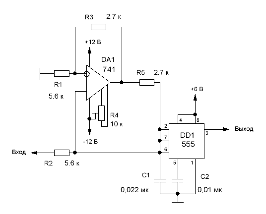 Имея в своём распоряжении операционный усилитель и интегральный таймер, можно сделать простой, но обладающий достаточно высокими параметрами преобразователь напряжения в частоту. Таймер DD1 включён по стандартной схеме мультивибратора с той лишь разницей, что времязадающий резистор заменён генератором тока на операционном усилителе DA1. Такое решение позволило получить нелинейность преобразования, не превышающую 3%. При указанных на схеме номиналах элементов изменение входного напряжения от 0 до 5 В вызывало линейное увеличение частоты на выходе устройства от 0 до 21 кГц (коэффициент преобразования 4,2 кГц/В).