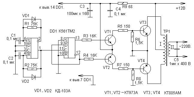 Устройство,описанное ниже,преобразует постоянное автомобильное постоянное напряжение 12 В. в переменное 220 в., с частотой 50 Гц. Выходная мощность около 30 Вт. Оно под нагрузкой потребляет ток около 2,5 А. Преобразователь содержит задающий генератор на частоту 100Гц на триггере DD1.1, делитель частоты на 2 на триггере DD1.2, предварительный усилитель на транзисторах VT1, VT2 и усилитель мощности на транзисторах VT3,VT4, нагруженный трансформатором Т1.