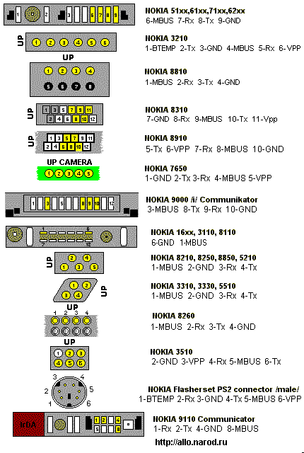 Распиновка для сотовых телефонов Nokia(много моделей)