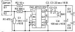 Устройство (его схема изображена на рис. 1) собрано на основе специализированной микросхемы КР1211ЕУ1. Она, как известно, предназначена для построения нестабилизированных преобразователей напряжения и содержит RC-генератор с внешней частотозадающей цепью, два работающих в противофазе мощных буферных каскада и несколько элементов управления. Проведенные автором исследования показали, что встроенный генератор начинает работать, когда напряжение на конденсаторе С1 частотозадающей цепи достигает определенного значения (при меньшем напряжении микросхема находится в "спящем" состоянии и потребляемый ею ток очень мал). Это натолкнуло на мысль включить датчик влажности (присутствия воды), состоящий из элементов Е1 и Е2, в частотозадающую цепь генератора. В отсутствие воды сопротивление между элементами датчика велико, напряжение на резисторе R1, а следовательно, и на