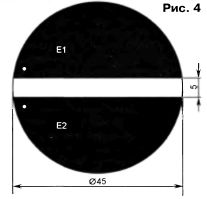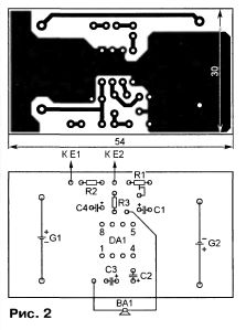 конденсаторе С1 практически отсутствует и генератор микросхемы не работает. С появлением воды сопротивление датчика уменьшается, напряжение на резисторе и конденсаторе возрастает и генератор самовозбуждается. Частота генерируемых импульсов не превышает долей герца, поэтому динамической головкой ВА1 сигнал не воспроизводится. Однако, поскольку форма импульсов близка к прямоугольной, спектр колебаний довольно широк, поэтому головка излучает щелчки. Для повышения экономичности устройства она подключена к выходам буферных каскадов через соединенные последовательно оксидные конденсаторы довольно большой емкости С2 и СЗ. Питается сигнализатор от батареи, составленной из двух литиевых элементов CR2025 напряжением 3 В каждый. Выключатель в цепи питания отсутствует, так как ток в дежурном режиме не превышает нескольких микроампер. Шунтирующий батарею питания конденсатор С4 сглаживает пульсации напряжения, вызванные импульсной нагрузкой. Большинство деталей смонтировано на печатной плате (рис. 2) из односторонне фольгированного стеклотекстолита. Постоянные резисторы — МЛТ, С2-23, Р1-4, подстроечный — СПЗ-19а, конденсаторы — оксидные импортные (например, серии ТК фирмы Jamicon), динамическая головка — любая мощностью 0,25... 1 Вт со звуковой катушкой сопротивлением 8... 16 Ом. Элементы питания CR2025 устанавливают в специальные держатели, закрепленные пайкой на плате. Можно, конечно, составить батарею и из гальванических элементов типоразмера АА или AAA, но габариты устройства в этом случае увеличатся. Смонтированную плату и динамическую головку размещают в пластмассовом корпусе подходящих размеров. Автор использовал круглый корпус диаметром 65 и высотой 27 мм (рис. 3). Плата с помощью термоклея закреплена на его дне, а динамическая головка — на крышке, в которой просверлены несколько отверстий для прохода звука. Датчик представляет собой круглую пластину (рис. 4), вырезанную из одностороннего фольгированного стеклотекстолита толщиной 1...1,5 мм. Оба участка фольги (Е1 и Е2) облуживают хорошо разогретым паяльником и, припаяв соединительные провода, покрывают все остальные поверхности влагостойким лаком или краской. Датчик приклеивают влагостойким клеем ко дну корпуса фольгой наружу. Нижняя часть корпуса должна быть герметичной, поэтому после проверки устройства на работоспособность отверстие, через которое проходят провода, соединяющие датчик с сигнализатором, а также все щели и швы (если таковые есть) необходимо тщательно замазать герметиком. Для защиты динамической головки от попадания воды крышку следует накрывать тонкой полиэтиленовой пленкой.