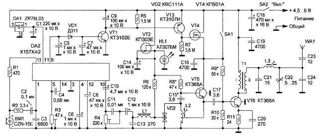 микросхеме амплитудного детектора (вывод 9) используется для работы системы голосового управления. При произнесении слов перед микрофоном ВМ1 на выводе 9 DA2 образуются всплески напряжения до 1,2 В, которые через диод VD1 заряжают конденсатор С7. Когда напряжение на этом конденсаторе достигает примерно 0,6 В, транзистор VT1 открывается, заряжая конденсатор С9. В результате открываются транзисторы VT3 и VT4 и на усилитель мощности радиомикрофона, собранный на транзисторе VT6, поступает напряжение питания. Начинается передача. Если возникает голосовая пауза, то через определяемые постоянной времени цепи R5C9 примерно 20...30 с транзистор VT4 закрывается и отключает усилитель мощности. При равномерном постоянном шуме, даже очень громком, всплесков напряжения на выводе 9 микросхемы DA2 нет, транзистор VT4 остается закрытым, а радиомикрофон — в дежурном режиме. Ток потребления при этом — 4...4,5 мА, при передаче он возрастает до 25...30 мА. Диод VD1 препятствует разрядке конденсатора С7 через выход микросхемы DA2. Таким образом, находясь в постоянной готовности к работе, радиомикрофон не транслирует общий шум, а реагирует только на голос средней громкости с расстояния 10...15 см. К небольшой задержке включения несложно приноровиться, а задержка отключения на 20...30 с позволяет комфортно работать без провалов в трансляции. Выключателем SA1 выбирают вариант работы с микрофоном: когда его контакты разомкнуты, действует система голосового управления, когда замкнуты, передатчик включен постоянно. Напряжение питания 3 В поступает на микросхему DA2 от интегрального стабилизатора DA1. Хотя рекомендуемое напряжение питания микросхемы К157ХА2 3,6...6 В [5], эксперименты показали, что она вполне удовлетворительно работает и при таком напряжении. Работоспособность всего радиомикрофона сохраняется при снижении напряжения первичного источника питания до 4,5 В. Конденсаторы СЮ и С12 — разделительные. Конденсатор С11 вместе с введенной частью резистора R4 — частотно-зависимая цепь предыскажения модулирующего сигнала. Фильтр L1C13 не допускает проникновения несущей частоты в микрофонный усилитель. Задающий генератор радиомикрофона собран на высокочастотном (граничная частота — не менее 900 МГц) транзисторе VT5 по схеме индуктивной трех-точки. Такой генератор немного сложнее в исполнении, чем собранный по схеме емкостной трехточки (требуется отвод от контурной катушки), но обладает лучшей стабильностью частоты и содержит меньше конденсаторов. Емкость конденсатора связи С15 выбирают минимальной, при которой генератор уверенно возбуждается. В этих условиях влияние транзистора VT5 на контур L2VD2 незначительно, потери сведены к минимуму и сохраняется высокая добротность контура. Стабильность рабочей точки транзистора VT5 достигнута под- ключением резистора R8 к стабилизатору напряжения смещения, собранному на светодиоде HL1, ток через который задан полевым транзистором VT2. Светодиод одновременно служит индикатором включения радиомикрофона. Напряжение этого же стабилизатора через резистор R6 поступает на вари-капную матрицу VD2, задавая ее рабочую точку. Требования к точности поддержания режима транзистора VT6 в усилителе мощности не столь высоки, поэтому особых мер по его стабилизации не принято. Благодаря малой емкости разделительного конденсатора С17 связь с задающим генератором слабая и