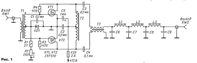 На диапазонах 1,8—7 МГц усилитель обеспечивает выходную мощность 5 Вт (CW) и 6 Вт (SSB, PEP) при входной мощности 100 мВт. На диапазоне 10,1 МГц эти параметры обеспечены при входной мощности 300 мВт. Измеренные на двухтональном сигнале интермодуляционные искажения — не хуже -30 дБ по отношению к несущей. Подавление гармонических составляющих в выходном сигнале — не хуже -50 дБ по отношению к несущей. Усилитель отличается высокой надёжностью, не возбуждается при любом значении КСВ нагрузки и при полной выходной мощности выдерживает замыкание выхода. Схема усилителя показана на рис. 1. Противофазные сигналы на затворах полевых транзисторов VT1 и VT2 обеспечивает трансформатор Т1. Отрицательная обратная связь через резисторы R3 и R4 стабилизирует работу усилителя и расширяет его рабочую частотную полосу. Напряжение питания на стоки транзисторов усилителя подается через симметрирующий трансформатор Т2. Выходной сигнал поступает на BALUN (трансформатор ТЗ) и далее на выход через ФНЧ L1-L3C6-C9. В цепь, задающую напряжение смещения на затворах транзисторов усилителя, включен стабилитрон VD1 на напряжение стабилизации 3,3 В. Однако основное его назначение — не стабилизация напряжения, а регулирование напряжения смещения в зависимости от температуры теплоотводов транзисторов усилителя. При повышении температуры напряжение смещения уменьшается, снижая ток покоя через транзисторы. Стабилитрон VD1 установлен так, чтобы был обеспечен тепловой (но не электрический!) контакт с теплоотводами. Для этого использована теплопроводящая паста. Напряжение питания усилителя — 13 В. Начальный ток покоя транзисторов устанавливают в пределах 200...300 мА подстроечным резистором R2. Ток, потребляемый усилителем от источника питания, при входной мощности 100 мВт и подключенном к его выходу эквиваленте антенны сопротивлением 50 Ом должен быть близок к 1 А. Корректновыбранные по размерам теплоотводы после нескольких минут работы должны нагреваться до приемлемой (по касанию рукой) температуры. Усилитель мощности собран на печатной плате из фольгированного с обеих сторон стеклотекстолита толщиной 2 мм. Чертеж платы изображен на рис. 2. С одной стороны платы вырезаны монтажные площадки, к которым припаивают выводы всех элементов усилителя. Вторая сторона платы, используемая как общий провод и экран, соединена с рабочей стороной в нескольких точках, обозначенных буквами X. Трансформаторы Т1—ТЗ намотаны на кольцевых магнитопроводах фирмы Amidon FT50-43 типоразмера 12,7x7,15x4,9 из феррита с начальной магнитной проницаемостью 850. Все обмотки содержат по 11 витков провода диаметром 0,5 мм у Т1 и диаметром 0,64ммуТ2иТЗ. Индуктивность, число витков катушек и емкость конденсаторов выходного ФНЧ для различных диапазонов указаны в таблице. Катушки намотаны проводом диаметром 0,64 мм на кольцевых магнитопроводах из карбонильного железа фирмы Amidon T68-2 типоразмера 17,5x9,4x4,8. Феррито-вые магнитопроводы здесь неприменимы, поэтому в отсутствие колец из карбонильного железа катушки можно выполнить бескаркасными. В этом случае придётся, по-видимому, несколько увеличить размеры платы, чтобы разместить на ней такой ФНЧ. Оксидный конденсатор С5 — тантаповый на номинальное напряжение не менее 25 В Остальные — керамические. При отсутствии кон-