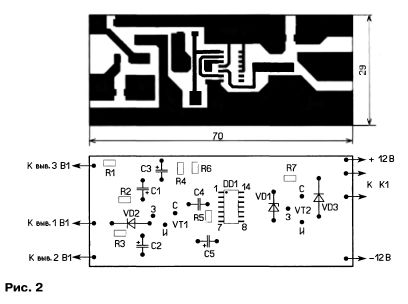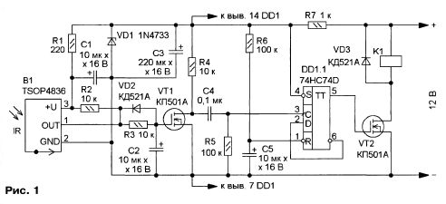 Предлагаемый выключатель позволяет подавать питание или сигнал на различные устройства, а управлять им можно с помощью ИК пульта дистанционного управления (ПДУ) различной бытовой аппаратуры: телевизора, CD (DVD) проигрывателя и т. д. Схема устройства показана на рис. 1. Принимает сигналы управления от ПДУ и преобразует их в электрические сигналы специализированный модуль В1. На транзисторе VT1 собран инвертирующий усилитель, на D-триггере DD1.1 — делитель частоты на два, на транзисторе VT2 и реле К1 — электронный выключатель. Питание триггера и усилителя стабилизировано параметрическим стабилизатором напряжения R7VD1 и сглажено конденсатором СЗ, а питающее напряжение модуля В1 дополнительно фильтрует RC-фильтр R1C1 Диод VD3 защищает транзистор VT2 от ЭДС самоиндукции при обесточивании реле К1. ![]() В исходном состоянии после подачи питающего напряжения триггер с помощью RC-цепи R6C5 устанавливается в нулевое состояние с низким уровнем напряжения на прямом выходе (вывод 5), поэтому транзистор VT2 закрыт и реле К1 обесточено. Его контакты (на схеме не показаны) могут быть замкнуты или разомкнуты (в зависимости от типа реле). При отсутствии ИК сигнала на выходе модуля В1 присутствует высокий уровень, поэтому конденсатор С2 зарядится через резистор R3 до этого уровня и транзистор VT1 будет открыт. ![]() Если нажать на одну из кнопок ПДУ и направить на модуль В1, на его выходе будут формироваться пачки импульсов. Поэтому конденсатор С2 быстро разрядится через диод VD2 и транзистор VT1 закроется. Перепад напряжения на его стоке через конденсатор С4 поступит на вход С триггера DD1.1 и переключит его в единичное состояние с высоким уровнем на прямом выходе. Транзистор VT2 откроется, на реле поступит питающее напряжение и его контакты переключатся, подавая или отключая питающее напряжение (или сигнал) от потребителя. После прекращения подачи ИК импульсов на модуль В1 на его выходе снова установится напряжение высокого уровня, конденсатор С2 зарядится, транзистор VT1 откроется, а конденсатор С4 разрядится. Следующая подача ИК импульсов на модуль В1 приведет к разрядке конденсатора С2, закрыванию транзистора VT1 и переключению триггера DD1.1, поэтому транзистор VT2 закроется, а реле будет обесточено. Таким образом, после каждой подачи И К излучения от ПДУ устройство переключается из одного состояния в другое. В устройстве применены резисторы для поверхностного монтажа — Р1-12, РН1-12, но их можно заменить на МЛТ, С2-23, устанавливая перпендикулярно плате. Оксидные конденсаторы — К50-35 или импортные, конденсатор С4 — К10-17. Модуль TSOP4836 заменим на SFH503-36; диоды КД521А — на 1N4004, 1N4005, 1N4006, а стабилитрон 1N4733 — на 1N5338B. Реле должно срабатывать при напряжении 10...11 В; его выбирают в зависимости от коммутируемых напряжения и тока. Например, реле TRR-1F-12-D рассчитано на коммутацию напряжения до 12 В при токе до 1 A, a TRB-12VDC-FB-CD — до 30 В при токе до 3 А. Все детали, кроме реле, монтируют на печатной плате из одностороннего фольгированного стеклотекстолита, чертеж которой показан на рис. 2. Питать устройство можно от сетевого (в том числе и нестабилизированного) источника питания с выходным напряжением 11...13В и током, достаточным для работы реле.