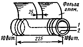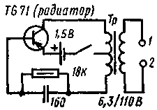 Рис.1 Трансформатор Тр (накальный) - 6,3 В/127 В. Электроды смонтированы на пластмассовой трубке (рис.2). На ее концах намотан провод-без изоляции (по 10 витков). Поверх провода укладываются две ленты металлической фольги на расстоянии 25 мм. В процессе электризации берутся за обкладки из фольги.