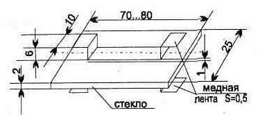 Рис. 2. Каркас для намотки высоковольтного трансформатора Т1 Высоковольтный трансформатор Т1 выполнен на пластинах из трансформаторного железа, набранных в пакет (рис. 6.22). Такая конструкция позволяет исключить намагничивание сердечника. Намотка выполняется виток к витку: сначала вторичная обмотка 2 2000 витков проводом ПЭЛ диаметром 0,08...0,12 мм (в четыре слоя), затем первичная 1 20 витков. Межслойную изоляцию лучше выполнять из нескольких слоев тонкой (0,1 мм) фторопластовой ленты, но подойдет также и конденсаторная бумага (ее можно достать из высоковольтных неполярных конденсаторов). После намотки обмоток трансформатор необходимо залить эпоксидным клеем. В клей перед заливкой желательно добавить несколько капель конденсаторного масла и хорошо перемешать. Для удобства заливки можно изготовить картонный каркас по габаритам трансфоратора, где и выполняется герметизация. Изготовленный таким образом трансформатор обеспечивает во вторичной обмотке амплитуду напряжения более 90000 В, но включать его без защитного разрядника F1 не рекомендуется, так как при этом возможен пробой внутри катушки. Защитный разрядник выполняется из двух оголенных проводов, расположенных на расстоянии 20...24 мм (для воздуха пробойное напряжение составляет примерно 3 кВ на 1 мм зазора). Конструкция излучателя А1 приведена на рис. 6.23. Элементы конструкции крепятся на боковых пластинах из оргстекла толщиной 5...10 мм (на рисунке не показаны). В зазоре между токопроводящими пластинами и стеклом (1 мм) образуется равномерно распределенная дуга. Ее хорошо видно при затемнении синяя полоса и характерный запах. Для большей эффективности работы прибора можно использовать любой вентилятор, например типа ВН-2 он ускорит циркуляцию воздуха в рабочей зоне излучателя. Описанное устройство создает низкую концентрацию озона, и для освежения воздуха в жилом помещении необходима его работа в течение 10...20 минут.