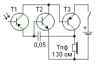 Этот небольшой приборчик - генератор низкой частоты на транзисторах Т2 и Т3 с фототранзистором Т1, роль которого может выполнять любой маломощный транзистор с удаленным колпачком. В передней стенке футляра, против полупроводниковой пластинки фототранзистора крепится собирательная линзочка. С помощью зажима прибор крепится на кармане пиджака линзой вперед.