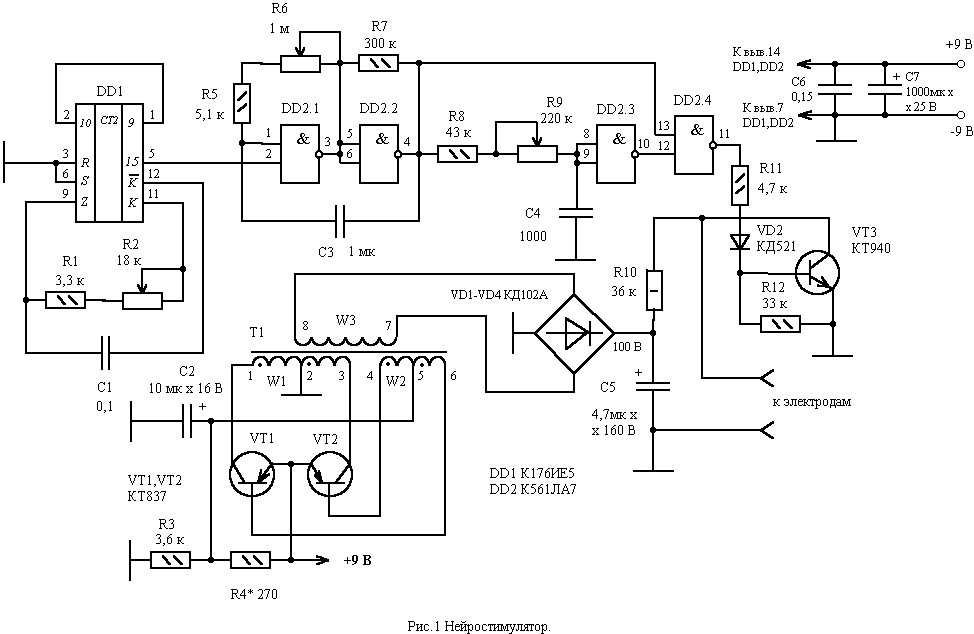 Малоподвижный образ жизни, болезни, а иногда просто лень атрофируют наши мышцы. Уменьшается кровоснабжение мышц и органов. Биологически активные точки (точки акупунктуры) теряют связь между собой, что приводит к нарушению обмена энергией между ними. Это чревато новыми болезнями и ухудшением самочувствия. Человек угасает на глазах. Лень надо прогнать. А для больных людей и для людей, ведущих вынужденный малоподвижный образ жизни, например на работе, предназначен этот прибор. Нейростимулятор не качает мышцы, как ошибочно думают многие, насмотревшись рекламы, а разогревает их, усиливая кровоток. Особенно нужен такой прибор людям, находящимся долгое время на больничной койке после автомобильных аварий, с повреждениями позвоночника, парализованных. Хорошо применить его и для больных различного рода артритами с ограниченной подвижностью. Нейростимулятор имеет следующие параметры выходных импульсов: Выходное напряжение 100 В. Длительность пачек импульсов 1-70 с. Период пачек импульсов 1-110 Гц. Длительность импульсаP - 50-250 мкс. Параметры выходных импульсов взяты на сайте разработчика промышленного прибора www.bodyshapers.com. Функционально нейростимулятор состоит из двух генераторов импульсов, формирователя длительности импульсов, преобразователя напряжения и выходного усилителя. Генератор импульсов, реализованный на микросхеме DD1, на выходеP выдает импульсы периодом от 1 секунды до 70 секунд (рис.1).