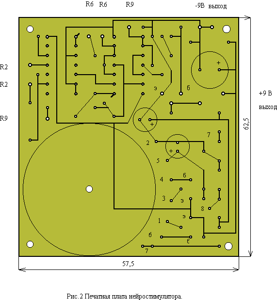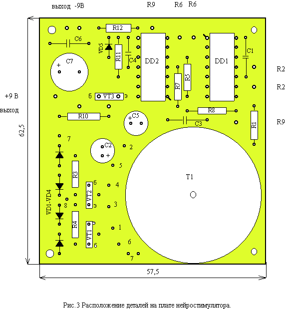 Период импульсов устанавливается резистором R2. Импульсы первого генератора запускают второй генератор, реализованный на элементах DD2.1, DD2.2. Период этих импульсов устанавливается резистором R6. Таким образом, длительность импульсов первого генератора заполняется импульсами второго генератора. Пауза между пачками импульсов равна половине периода первого генератора. Для регулирования субъективного ощущения, выходные импульсы имеют одинаковую длительность, формируемую формирователем на элементах DD2.3, DD2.4. Длительность выходных импульсов от 50 до 250 мкс устанавливается резистором R9. На выводе 11 DD2.4 получаем импульсы отрицательной полярности. Поэтому выходной транзистор VT3 в паузах между пачками импульсов открыт, а во время прохождения импульсов закрыт. Нагрузочный резистор R10 ограничивает выходной ток до 27-30 мА, обеспечивая безопасность человека. Преобразователь напряжения собран по стандартной схеме мультивибратора на транзисторах VT1, VT2 структуры pnp. Трансформатор Т1 намотан на ферритовом кольце 30х15х6 2000НМ1. Обмотка 1 содержит 2х43 витка провода ПЭВ2-0,5, обмотка 2 содержит 2х14 витков, а обмотка 3 содержит 450 витков. Обмотки W2, W3 намотаны проводом ПЭВ2-0,27 (0,30). Сначала наматывается обмотка W3, затем в два провода обмотки W1,W2.. Конец одной обмотки W1 и W2 соединяется с началом второй, обеспечивая фазировку витков. Если после включения преобразователя на выходе диодного моста нет напряжения, то необходимо поменять местами выводы 1-3 или 4-6 трансформатора. Резистор R4 подбирается по минимуму потребляемого тока и по устойчивости запуска преобразователя при включении напряжения питания. Потребляемый ток преобразователя без нагрузки 20 мА. Общий потребляемый ток нейростимулятора 60 мА. Трансформатор блока питания необходимо рассчитывать на больший ток, так как кратковременно, при включении преобразователь потребляет больший ток. Это обусловлено установкой переходных процессов автогенератора. Чертеж печатной платы показан на рис.2, а расположение элементов на плате на рис.3.