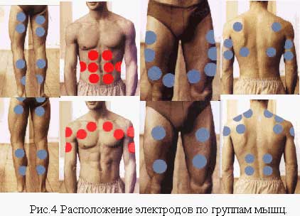 Электроды лучше сделать круглыми из белей жести (никелированной) диаметром 40-50 мм. Края электродов скругляются надфилем, чтобы электрод не врезался в тело. После припайки тонких проводов, сторона пайки заливается герметиком. На руках и ногах электроды лучше прикреплять с помощью укороченного эластичного бинта. На туловище надо сделать специальный бандаж на резинке и застежке на пуговицах или липучке. Если вы идете на работу, то бандажи можно надеть заранее. Ориентировочное расположение электродов на теле начало и окончание мышцы. Приблизительно установка электродов (от производителя) дана на рис.4.