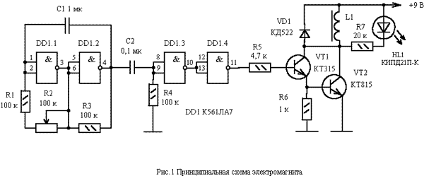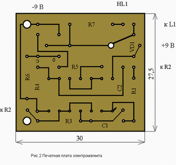Устройство состоит из трех функциональных блоков генератора, формирователя и усилителя тока. Генератор собран по схеме мультивибратора на элементах DD1.1, DD1.2. Формирователь короткого импульса состоит из дифференцирующей цепочки C2,R4 и элементов DD1.3, DD1.4. Усилитель тока собран на транзисторах VT1, VT2, работающих в ключевом режиме. Диод VD1 необходим для защиты транзисторов от пробоя токами самоиндукции. Светодиод можно взять типа АЛ307 или любой другой, уменьшив номинал резистора R7 до 2 к. Но при такой замене увеличится потребляемый ток. Электромагнит имеет сопротивление обмотки не менее 20 Ом. Катушка электромагнита наматывается на каркасе с внутренним диаметром 10 мм и наружным 20мм проводом ПЭВ-2 0,22. Катушку можно взять готовую от ниток, но обязательно деревянную. Намотка до заполнения каркаса. Последний слой намотки, вместе с припаянными гибкими проводами длиной около 50 см, обматывается изолентой. В отверстие катушки вставляется магнитопровод сердечник, сделанный из мягкой стали, например, сталь 3. В качестве сердечника для катушки, взятой от ниток, хорошо ввинчивается болт М10 без головки. Прибор собирается в подходящую коробку, где устанавливается регулятор частоты, светодиод, батарея типа (Крона). Провод от магнита подключается к прибору стерео разъемом, который одновременно выполняет функцию выключателя питания. При первом включении контролируют изменение частоты включения светодиода при вращении регулятора частоты. Работу магнита можно проверить, если поднести его к экрану цветного телевизора это безопасно. На экране синхронно со вспышками светодиода должны появляться затенения. Чертеж печатной платы показан на рисунке 2.