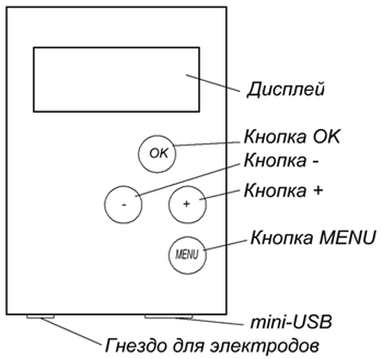 Прошивка v1.0Мозговой электростимулятор (далее стимулятор) предназначен для проведения ТЭС (TES) (транскриниальная электростимуляция) и ЦЭС (CES) (церебральная электростимуляция) терапии. Принцип его работы заключается в воздействии на головной мозг пациента слабыми электрическими импульсами сложной формы. Подробнее о ТЭС (TES) и ЦЭС (CES) терапии можно прочитать в различных источниках. Для поиска руководствуйтесь следующими терминами: [транскриниальная электростимуляцияk, [центр транскриниальной электростимуляцииk, [Доктор ТЭСk, [Трансаирk, [Альфарияk. ПЕРЕДНЯЯ ПАНЕЛЬ СТИМУЛЯТОРА На передней панели стимулятора расположены дисплей и кнопки. В нижней части располагаются два разъёма, один из них предназначен для подключения электродов, а второй для зарядного устройства формата mini-USB.