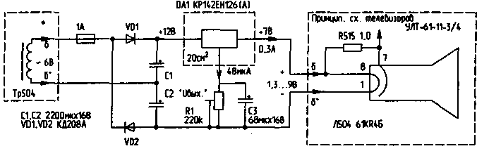 Схема, показанная на рисунке, используется для кинескопов с Uн=6,3 В и током накала Iн=0,3 А, т.е. для большинства черно-белых кинескопов.