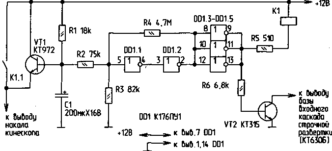 Второе устройство обеспечивает плавный разогрев накала кинескопа в черно-белых мониторах "Электроника" МС6105 и им подобных. На время разогрева блокируется работа строчной развертки монитора. После плавного разогрева на накал кинескопа подается полное напряжение 12В через замыкающиеся контакты К1.1.
