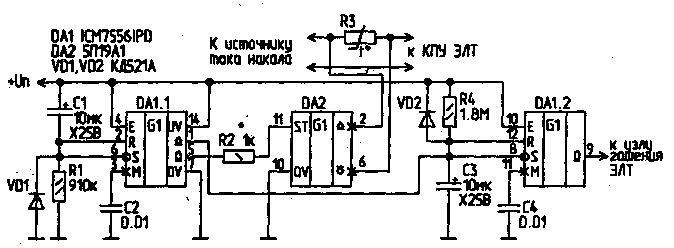 Принципиальная схема устройства показана на рисунке и состоит из терморезистора R3, реле DA2, узла управления реле DA2 на микросхеме DA1.1 и узла формирования сигнала гашения кинескопа на микросхеме DA1.2. Терморезистор R3 типа ТР15-16-0,8 включен последовательно в цепь накала КПУ кинескопа и предназначен для устранения броска тока накала при включении питания телевизора. В холодном состоянии его сопротивление равно 16 Ом, сопротивление холодной нити подогревателя КПУ Ro - около 3 Ом. При этом пусковой ток составляет Io= пусковая мощность Рo=НoIo=6,3x0,33=2,1 Вт. Для сравнения: пусковой ток накала незащищенного кинескопа I=6,3/3=2,1А, пусковая мощность Ро=6,3 2,1=13,23 Вт. Таким образом, терморезистор снижает пусковую мощность более чем в 6 раз. Если учесть, что в цепи накала КПУ кинескопа любого современного телевизора уже имеется токоограничиваю-щий элемент - резистор или индуктивность, то практически пусковая мощность снижается в 7...8 раз. Твердотельное реле DA2 предназначено для шунтирования терморезистора R3 после его выхода на номинальный режим. Сигнал включения реле формируется одновибратором DA1.1, запускаемым при включении напряжения питания. Длительность протекания тока накала через терморезистор R3 задается выбором постоянной времени цепи R1, С1 и вычисляется по формуле t[c]=1.1R [Мом]С[мкФ]. Напряжение гашения кинескопа на время прогрева КПУ вырабатывается вторым одновибратором DA1.2, постоянная времени которого задается цепью R4, СЗ и вычисляется аналогично. Напряжение с выхода DA1.2 подается на узел гашения кинескопа, схема которого определяется моделью телевизора и здесь не приводится, поскольку ее варианты подробно рассмотрены в [З]. Конденсаторы С2, С4 уменьшают до минимума влияние наводок и пульсации по цепям питания на работу одновибраторов. Диоды VD1, VD2 подавляют возможные выбросы напряжения при включении телевизора. Напряжение питания подается от одной из шин телевизора и может находиться в пределах 5...18 В без существенного изменения параметров устройства, необходимо лишь скорректировать номинал резистора R2 из условия обеспечения значения тока управления реле DA2 равного 10 мА. Мощность, потребляемая устройством в длительном режиме после окончания прогрева КПУ кинескопа, не превышает 200 мВт при питании 18 В и 55 мВт при питании 5 В. При включении телевизора на выходе одновибратора DA1.1 (вывод 5) появляется напряжение низкого уровня, разрядный выход (вывод 1) устанавливается в низкоомное состояние, шунтируя конденсатор СЗ и препятствуя его зарядке. При этом на выходе одновибратора DA1.2 (вывод 9) присутствует напряжение высокого уровня, поступающее на узел гашения кинескопа, ток в цепи управления реле DA2 (выводы 10, 11) отсутствует. В результате этого кинескоп закрыт, пусковой ток накала КПУ протекает через холодный терморезистор R3 и токоограничивающий элемент, предусмотренный схемой телевизора, что уменьшает пусковую мощность в 7...8 раз. По мере прогрева терморезистора R3, его сопротивление снижается, а сопротивление подогревателя КПУ возрастает. Время выхода терморезистора данного типа на номинальный режим составляет 2...3 с, при необходимости его можно увеличить, если приклеить терморезистор на небольшой радиатор, размеры которого определяются экспериментально. Применяемый клей должен быть термостойким. По окончании интервала времени после включения теле