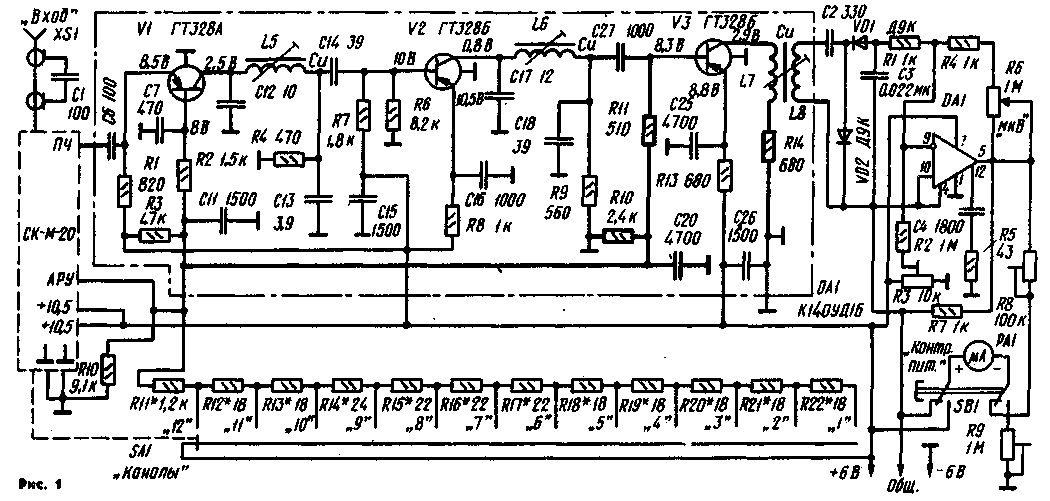Puc.5 Гетеродин на транзисторе V3 также переводят в режим усилителя ПЧ, но по схеме ОЭ. С этой целью удаляют конденсаторы С19-С24, катушку L7 и резисторы RIO, R12, сопротивление резистора R13 уменьшают до 680 Ом, а емкость конденсатора С25 увеличивают до 4700 пф; в цепь базы транзистора включают делитель из резисторов R10, R11 и конденсатора С20, к средней точке которого подводят напряжение АРУ с переключателя SA1. В коллекторную цепь транзистора V3 включают катушки L7, L8 и резистор R14. Печатная плата усилителя ПЧ дополнена небольшой пластиной из фольгированного стеклотекстолита толщиной 1 мм, припаянной перпендикулярно к основной. Она служит для соединения катушки L8 с УПТ. Налаживание прибора начинают со стабилизатора напряжений. Для этого движки подстроечных резисторов R23, R24 устанавливают в среднее положение, отключают стабилизатор от цепей питания и нагружают каждый источник резистором сопротивлением 510 Ом с мощностью рассеивания 0,5 Вт. Подключив батареи, измеряют напряжения на выходе стабилизатора и резисторами R23, R24 устанавливают их равными +6 и -6 В (±5%). Если этого сделать не удается, подбирают стабилитроны VD3, VD4. Далее приступают к регулировке УПТ и усилителя ПЧ. Движок резистора R3 устанавливают в среднее положение, резистора R6 УПТ - в положение минимального, а резисторов R8 и R9 - максимального сопротивления. Катушку L8 отключают от конденсатора С2 УПТ. Селектор каналов переключают на 12-й канал (обычно на нем - наименьшая чувствительность), а к контактам подвижного диска переключателя SA1 подпаивают переменный резистор сопротивлением 2,7 кОм (вместо резистора R11), установив его движок в среднее положение. Затем подключают источник питания и при нажатой кнопке SB1 "Контр, пит." подстроечным резистором R9 устанавливают стрелку микроамперметра на какую-либо отметку шкалы, которая в дальнейшем будет использоваться для контроля напряжения 12 В. Далее подстроечным резистором R3 добиваются нулевых показаний прибора при отпущенной кнопке. Эту операцию повторяют, установив движок переменного резистора R6 вначале в среднее, а затем - в крайнее нижнее (по схеме) положение. После этого вращением движка переменного резистора, подключенного к переключателю SA1, устанавливают начальное напряжение смещения +8 В, подаваемое на вход АРУ селектора каналов и усилителя ПЧ. Далее, подпаяв катушку L8 к конденсатору С2, снова устанавливают движок переменного резистора R6 в положение минимального сопротивления и градуируют шкалу лимба на оси резистора. С генератора сигналов на вход прибора подают немодулированное напряжение 200...500 мкВ частотой, равной средней частоте настраиваемого телевизионного канала. Плавно увеличивая сопротивление переменного резистора R6, устанавливают стрелку микроамперметра на среднюю отметку шкалы. Если этого не удается сделать, уменьшают сопротивление подстроечного резистора R8. Максимального отклонения стрелки добиваются вначале ручкой настройки гетеродина селектора каналов, а затем - поочередным вращением подстроечников катушек L5- L8. И наконец, переменным резистором, подключенным к переключателю SA1, добиваются максимальной чувствительности прибора по наибольшему отклонению стрелки, после чего, измерив сопротивление введенной части резистора, заменяют его постоянным. Затем уменьшают напряжение РЧ на входе прибора до 60 мкВ и переводят ручку 