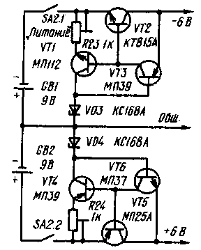 Принципиальная схема прибора представлена на рис.1. Он собран на базе селектора каналов СК-М-20 [I]. Трехкаскадный усилитель ПЧ (обведен штрих-пунктирной линией) выполнен на печатной плате от такого же селектора (детали усилителя обозначены в соответствии с его принципиальной схемой, а новые элементы и соединения - утолщенной линией). Для получения одинакового усиления прибора на всех каналах служит делитель R10-R22 и переключатель SA1, закрепленный на оси селектора каналов и обеспечивающий подачу напряжения смещения в цепь автоматической регулировки усиления (АРУ) селектора и в цепи баз транзисторов первого и третьего каскадов усилителя ПЧ в зависимости от канала. УПТ собран на ОУ DA1, охваченном ООС через резисторы R4, R6. Балансируют ОУ подстроечным резистором R3. К выходу УПТ через резистор R8 и кнопку SBI подключен микроамперметр РА1. На риску отсчета стрелку микроамперметра устанавливают при градуировке прибора подстроечным резистором R8. Резистором R9 добиваются отклонения стрелки микроамперметра на отметку 12 В в режиме контроля напряжения питания (кнопка SBI нажата). УПТ питается стабилизированным напряжением ±6 В от двуполярного источника (рис. 2), а селектор каналов и усилитель ПЧ - от него же, но напряжением 12 В (вывод -6 В соединен с их обшим проводом). За основу взято устройство, описанное в [2]. Стабильность напряжения питания сохраняется при снижении напряжения батарей GB1 и GB2 до 6,7 В. Ток. потребляемый самим стабилизатором, не превышает 1 мА. Прибор работоспособен и при уменьшении напряжения каждой из батарей до 5 В, но в этом случае ухудшается чувствительность и нарушается градуировка шкалы, поэтому прибор можно использовать только как индикатор при ориентировке антенн.