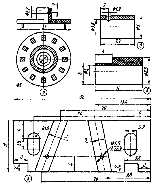 Puc.3 При сверлении отверстия диаметром 1,2 мм во втулку диска вставляют металлическую втулку (рис. 3, б). Затем с хвостовой части оси переключателя селектора каналов снимают стопорную пружину и латунную прокладку, надевают на ось диск переключателя и сверлят отверстие диаметром 1,2 мм под штифт. После закрепления диска штифтом стопорную пружину устанавливают на место. Неподвижные контакты 3 переключателя (см. рис. 4) изготовлены из токосъемных пластин селектора каналов СК-М-20 и закреплены между частями 1 и 2 изолирующей планки, для чего в одной из них (2) надфилем пропилены пазы глубиной 0,6 мм. Части планки изготовляют из эбонита или гетинакса (часть 1 толщиной 1,6, а часть 2 толщиной 3 мм) по чертежу, приведенному на рис. 3, г в тексте, и после установки контактов склеивают, а затем скрепляют заклепками 4 диаметром 1,5 мм с потайной головкой. Планку размещают на месте установки фильтра верхних частот селектора (см. рис. 3), а сам фильтр устанавливают на удлиненных изоляционных стойках (рис. 3, в).
