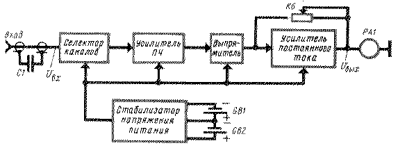 Точная ориентировка приемных телевизионных антенн при значительном расстоянии от передающей станции нередко вызывает затруднения. И очень часто используемый в подобных случаях способ установки их по изображению на экране телевизора не приводит к желаемым результатам. А от точности расположения антенны существенно зависит качество изображения, особенно цветного. Существенно облегчит ориентировку антенн прибор. Его можно использовать при установке антенн коллективного и индивидуального пользования на любом из 12 каналов диапазона метровых волн как в городе, так и в сельской местности. Прибор также позволяет измерять уровень сигнала на выходе антенны и определять возможность получения хорошего качества изображения, т. е. зону уверенного приема, оценивать исправность фидерных систем н антенных усилителей. В зоне неуверенного приема с его помощью можно наметить точку установки антенны на местности. Прибор обеспечивает измерение напряжения радиочастоты (РЧ) в пределах от 60 мкВ до 1 мВ (со съемным делителем 1:10 - до 10 мВ). Относительная погрешность измерения - не более 30%. Размеры - 200X115Х100 мм, масса - не более 1,5 кг. Питается прибор от четырех батарей 3336Л, потребляемый ток - не более 40 мА. Структурная схема устройства изображена на рисунке. Измеряемое напряжение и,, поступает на вход селектора каналов, где усиливается и преобразуется в колебания ПЧ. С выхода усилителя ПЧ сигнал подается на выпрямитель, а выделенная им постоянная составляющая - на вход усилителя постоянного тока (УПТ), нагруженного индикатором выходного напряжения.