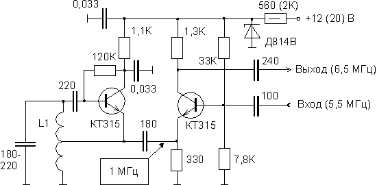 Предлагаемая простая схема позволяет преобразовать промежуточную частоту звука импортного телевизора из 5,5 МГц в 6,5 МГц. Изменив данные контура, можно менять эти частоты.