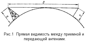 где Dрасстояние прямой видимости в км; Нвысота передающей антенны в м; hвысота приемной антенны в м (рис. 1).