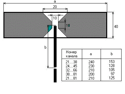 Самая простая, на мой взгляд, антенна для приема дециметровых волн. Но довольно эффективная. Антенна выполнена в виде широкополосного линейного разрезного вибратора, подключаемого к телевизору кабелем с волновым сопротивлением 75 Ом. С антенной кабель соединен через симметрирующую четвертьволновую петлю. Размеры вибратора в зависимости от интервала принимаемых каналов приведены в таблице. Коэффициент стоячей волны антенны не хуже 1,7. При этом потери мощности на отражение не превышают 5%. Если считать допустимыми 10 %-ные потери, то можно сделать антенну для приема на все каналах диапазона ДМВ, отведенного для телевизионного вещания. Вибратор вырезается из листа одностороннего фольгированного стеклотексто толщиной 1,5...2 мм. Если стеклотекстлит двусторонний, то можно снять фольгу со второй стороны листа, либо вырезать на ней точно такой же вибратор.