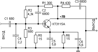 Простой широкополосный антенный усилитель обеспечивает усиление порядка 10 дБ во всем диапазоне, отведенном под телевизионное вещание. Усилитель представляет собой каскад с общим эмиттером и глубокой отрицательной обратной связью через R1 С2, а также эмиттерной коррекцией R5 R6 С5 Сб. Питание усилителя осуществляется по кабелю. Антипаразитная цепь R4 СЗ обеспечивает устойчивость антенного усилителя при больших КСВ в кабеле, что возможно, когда входное сопротивление телевизора значительно отличается от волнового сопротивления кабеля. Принципиальная схема усилителя приведена на рисунке.