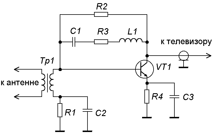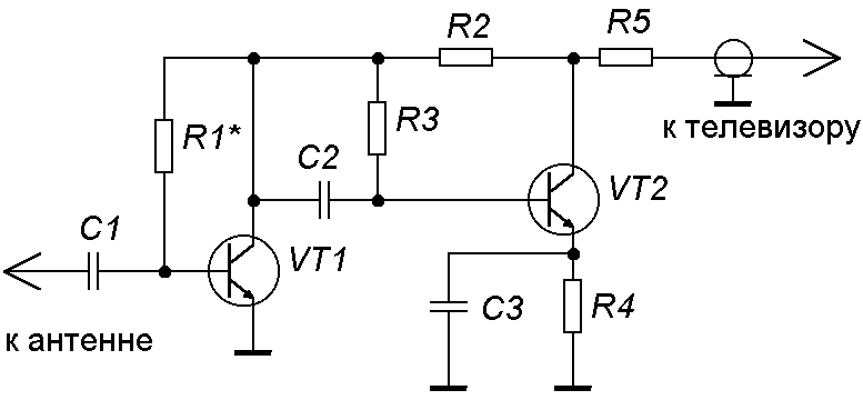 В статье подробно рассматривается устройство и принципы работы усилительных модулей широкополосных телевизионных антенн. Усилитель в телевизионной приёмной антенне предназначен, главным образом, для увеличения чувствительности, ограниченную шумами, а во вторую очередь для компенсации потерь принимаемого сигнала в коаксиальном кабеле. Сами телевизоры обладают весьма большим запасом собственного усиления, т.е. имеют высокую чувствительность, ограниченную усилением. Несколько хуже у них чувствительность, ограниченная синхронизацией. И наконец, наиболее низкая чувствительность, ограниченная шумами. Следовательно, фактором, определяющим дальний приём, следует принять уровень собственных шумов линейного тракта, а не коэффициент усиления. Влияние шума оценивают по отношению сигнал/шум, минимальное значение которого принято равным 20. Для телевизоров третьего пятого поколения чувствительность, ограниченная шумами, равна 50-100 мкВ. Однако при отношении сигнал/шум (с/ш) равном 20, наблюдаются плохое качество изображения и разборчивость только крупных деталей. Для получения изображения хорошего качества следует подать на вход телевизора полезный сигнал примерно в 4 раза больший, т.е. обеспечить отношение с/ш около 80. Используемые в настоящее время кабели с волновым сопротивлением 75 Ом в зависимости от конструкции и качества диэлектрика имеют погонное затухание 0,07 - 0,18 дБ/м в метровом и 0,25 - 0,6 дБ/м в дециметровом диапазоне волн. При длине кабеля 24 м общее затухание может составлять 1,2 - 2,4 дБ. В связи с этим усилитель должен иметь коэффициент усиления порядка 3 дБ для типичных условий приема. К нему прибавляют запас в 1214 дБ для усиления слабых сигналов, что необходимо из-за низкой эффективности широкополосных малогабаритных приёмных антенн. Любой усилитель имеет собственные шумы, которые усиливаются вместе с полезным сигналом и ухудшают отношение сигнал/шум. Поэтому важнейшим параметром усилительного элемента следует считать его коэффициент шума Кш. Для единой оценки шумов многокаскадного тракта существует показатель приведенного коэффициента шума Кш, который равен уровню шума на выходе, поделенному на общий коэффициент усиления, т.е. Кш = Кш.вых / КУ. Так как выходной уровень шума Кш.вых зависит в наибольшей степени от уровня шума первого транзистора, усиливаемого всеми последующими каскадами, шумами остальных каскадов можно пренебречь. Тогда Кш.вых= Кш1КУ, где Кш1 - коэффициент шума первого транзистора. Следовательно, получим Кш= Кш1, т.е. приведенный коэффициент шума усилительной части в основном определяется коэффициентом шума первого транзистора. Отсюда вытекает вывод - применение активной части может дать положительный результат тогда, когда коэффициент шума первого транзистора усилителя меньше коэффициента шума первого каскада телевизора. Коэффициент шума зависит также от качества согласования на входе усилителя и режима работы первого транзистора. Частотный диапазон усилителя должен обеспечить усиление сигнала в полосе частот вещательного телевидения f = 48-790 МГц. Для увеличения динамического диапазона усилитель должен иметь отрицательную обратную связь. В [1] рассмотрены принципы схемотехнического построения усилительных модулей для широкополосных активных антенн. Исследованы и приведены амплитудно-часто