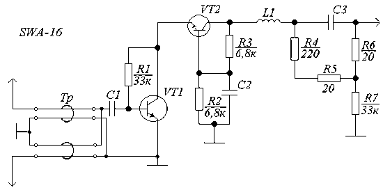 Рис.2,б. Двухкаскадный усилитель В каскадах на транзисторах, включенных по схеме с ОЭ, наиболее велико влияние внутренних связей и емкостей переходов транзисторов. Оно проявляется в ограничении полосы пропускания и склонности усилителя к самовозбуждению, вероятность которого тем больше, чем выше коэффициент усиления. Для его оценки известно понятие порога устойчивости - предельного значения коэффициента усиления, при превышении которого усилитель превращается в генератор. В качестве мер повышения устойчивости можно предложить включение транзисторов по каскодной схеме с ОЭ-ОБ. Каскодное включение транзисторов VT1 и VT2 (рис.3) позволяет реализовать хорошую однонаправленность и получить большую широкополосность усилительного модуля [1]. Это дает возможность отказаться от использования сигнальных обратных связей, стабилизирующих и корректирующих амплитудно-частотную характеристику а также входной и выходной импедансы звена. Здесь коэффициент передачи и присоединительные параметры схемы задаются режимно. Для уменьшения влияния паразитных индуктивностей общих выводов, снижающих коэффициент усиления каскада на верхних частотах, эмиттерные выводы входных танзисторов соединяются непосредственно с корпусом, а режим работы стабилизируется фиксированным током базы. Высокочастотный срез регулируется индуктивностью L1, включенной в коллекторную цепь оконечного транзистора.