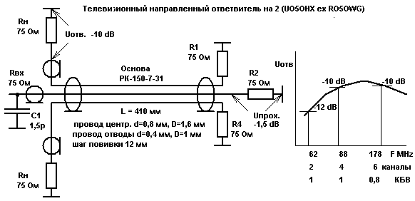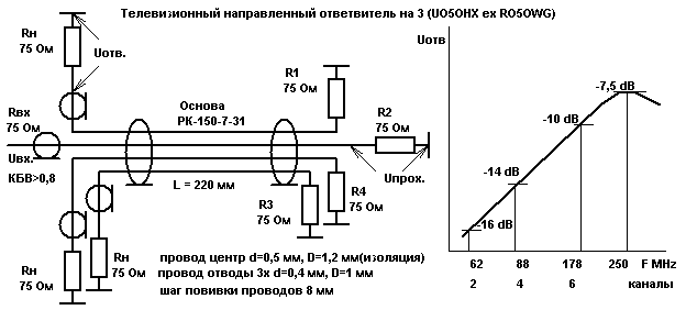 Ответвитель на 3 изготовлен на основе 220 мм кусочка кабеля РК-150-7-31 у которого удалена спиральная центральная жилка. Вместо нее продернуты свитые в жгут четыре одножильных проводника в изоляции. Концы проводников нагружены на сопротивления 75 Ом. а их начала (там-же где и вход) подключаются к магистральным кабелям. Частотная характеристика ответвителя примерно зеркальна затуханию в кабеле, что обеспечивает равенство сигналов по каналам на выходе магистрали. 2.Ответвитель на 2 с максимальной связью