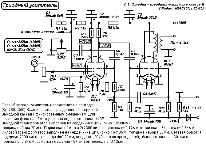 Двухтактный усилитель на триод-пентодах. Pвых=10 Вт