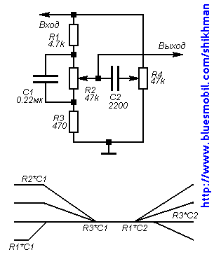 Пассивный регулятор тембра с несимметричной характеристикой регулирования Главная -> Статьи -> Регуляторы громкости, тембра, эквалайзеры -> Пассивный регулятор тембра с несимметричной характеристикой регулирования