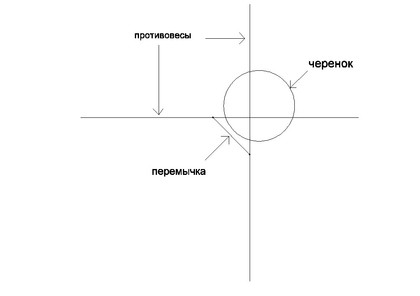 В черенке на 5см ниже катушки L4 перпендикулярно, но с разницей по высоте в 5мм было просверлено два сквозных отверстия - для будущих противовесов. Вставлялись и пропаивались противовесы. Схематично их крепление можно увидеть ниже: