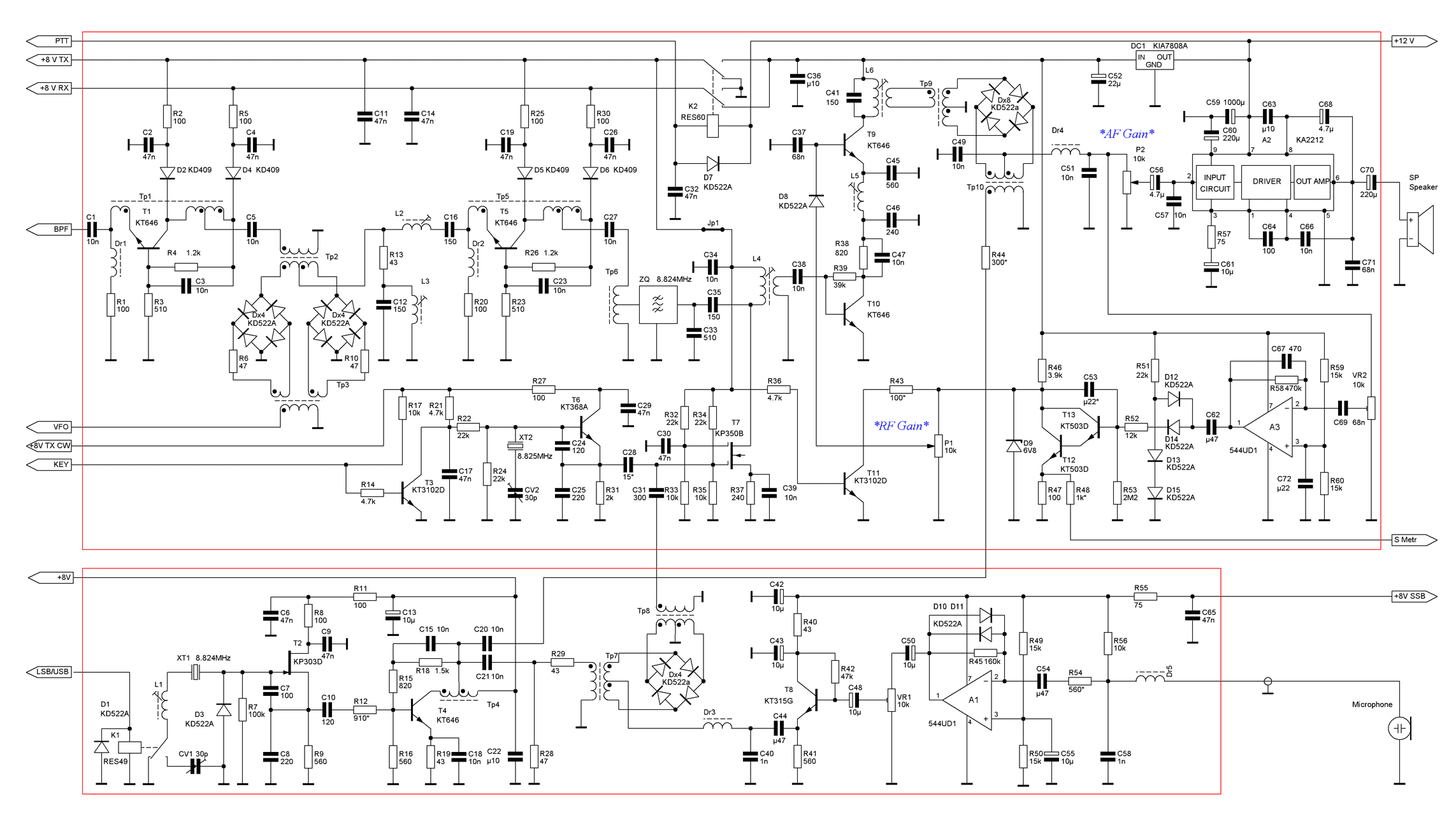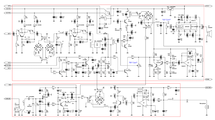 В данной схеме усиление составляет 40дБ при хорошем запасе по перегрузке. В режиме передачи УПЧ используется для самоконтроля CW/SSB. Возможности данного узла гораздо большие. Ограничение в 40дБ наложило одноплатное исполнение. При исполнении отдельным блоком легко довести усиление до 60дБ при том же, практически, уровне собственных шумов. Схема испытывалась. Я её умышленно не привожу. Дабы шаловливые ручки не «улучшили» то что уже сделано. Это будет другой трансивер, с другой концепцией. А хороший конструктор и сам разберется.