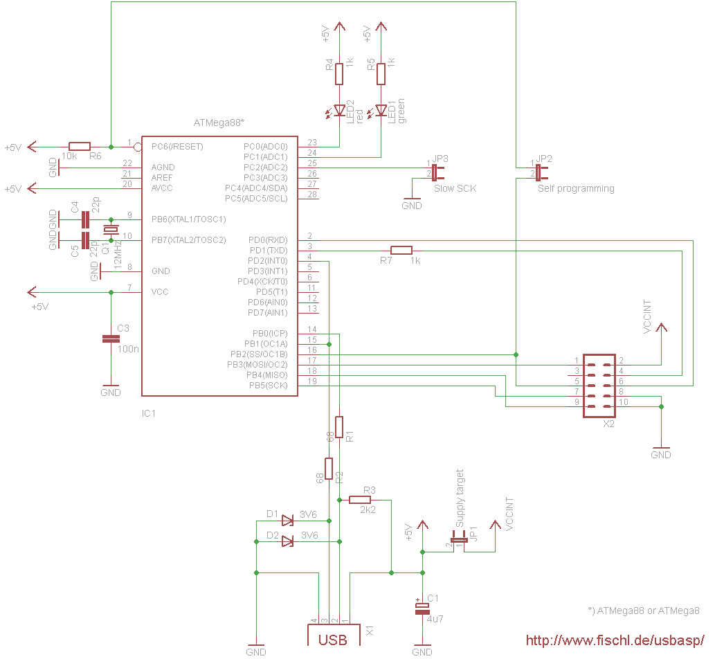 USBasp - простой внутрисхемный USB-программатор для микроконтроллеров Atmel AVR. Программатор построен на микроконтроллере ATMega88 (или ATMega8) и содержит минимум деталей. Программатор использует свой USB-драйвер, никакие специальные USB контроллеры не нужны.