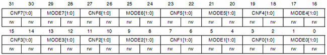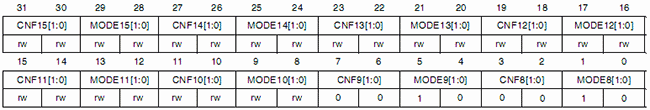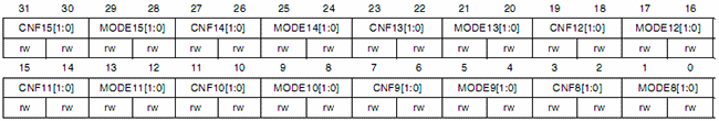 Настройка каждого вывода порта занимает четыре бита данных. Настройки младших 8 выводов порта расположены в регистре GPIOx_CRL, настройки старших 8 бит расположены в регистре GPIOx_CRH.