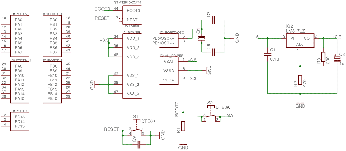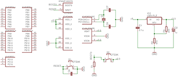 И здесь для начинающих возникает вопрос в чем и как рисовать и разводить печатные платы для, например, 144-ногого микроконтроллера (48-ноги еще куда не шло). Однако ничего страшного в рисовании схемы, разводке и пайке данных контроллеров нет. Для этого можно пользоваться программой Eagle (она содержит библиотеку компонентов ST или в крайнем случае можно поискать в Интернете или скачать внизу статьи), можно попробовать рисовать платы в старом добром Sprint-е (хотя, первый вариант мне кажется более надежным). Ниже приведены стандартные схемы включения контроллеров семейства Value line STM32F100С4 и Connectivity line STM32F105