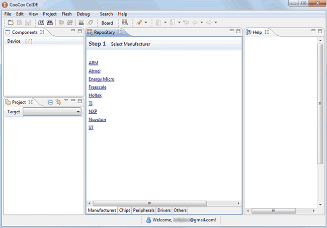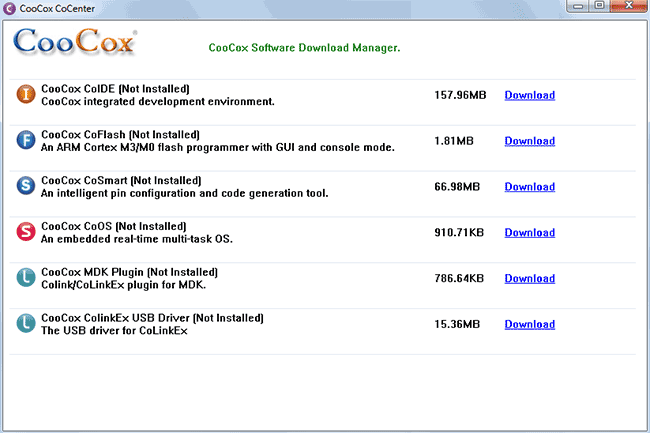 Итак приступим. Идем на официальный сайт CooCox и качаем последнюю версию CoCenter. Для скачивания необходимо зарегистрироваться, регистрация простая и бесплатная. Затем инсталлируем скачанный файл и запускаем: