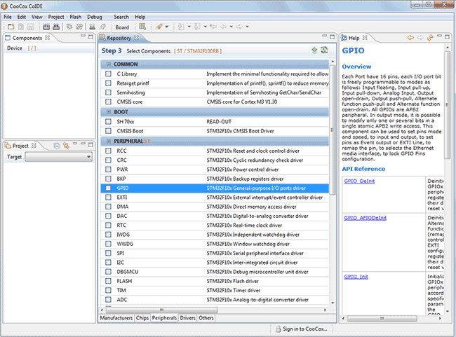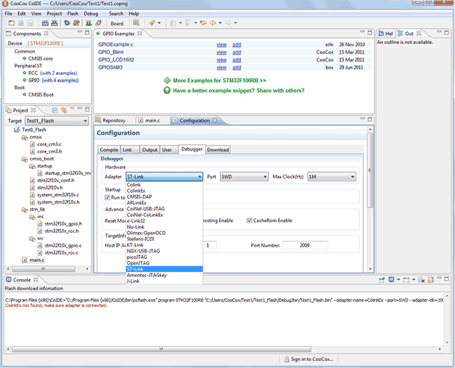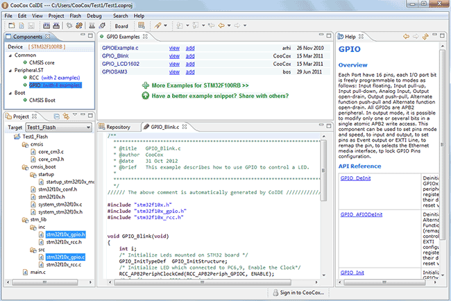 Чем еще хорош CoIDE, это тем, что в нем есть возможность загружать примеры прямо в среду разработки. В вкладке Components вы можете видеть, что почти к каждой библиотеке есть примеры, нажимаем на GPIO (with 4 examples) и видим их: